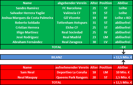 Der zweite Abgang wiegt weitaus schmerzlicher. Sam Neal, geborener Engländer, aber bereits seit seinem dritten Lebensjahr im Baskenland wird künftig für Deportivo La Coruña auflaufen. Bei einem Marktwert von 1,9 Millionen € legten die Galicier ein Hammerangebot von 10 Millionen € auf den Tisch, das abzulehnen wäre fahrlässig gewesen. Auch Bilbao stieg in den Poker ein, wurde aber mit seinem 8,5 Millionen € Offert von 'Depor' klassisch ausgestochen. Mit Alonso hat man ein weiteres Talent aus dem eigenen Nachwuchs in der Hinterhand, dennoch wird am Flügel der Kader auch schon relativ dünn, neben Gayà und Capa stehen nun nur noch Fernando Alonso und Dani Nieto im Kader, die vorher genannten Pedro und Rivera kommen zumeist im Sturm zum Einsätz, wären aber Alternativen, wenn im Angriff wieder genug Spieler vorhanden sind.