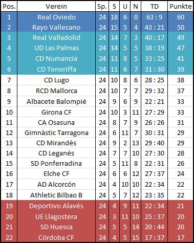 Schade, dass man in der Copa del Rey ohne Niederlage ausgeschieden ist, das Auswärtstor hat SD Eibar letztendlich zum Weiterkommen gereicht... aber so kann man sich wenigsten voll und ganz auf das große Ziel "Wiederaufstieg" konzentrieren! Und da sieht es nach dem 24. Spieltag sehr gut aus für Real Oviedo... einem 3:0 Auswärtssieg bei AD Alcorcón folgte ein klares 6:0 zu Hause gegen SD Huesca... gegen SD Ponferradina reichte es dann nur zu einem 1:1 aber man kann ja auch nicht jeden Gegner aus dem Stadion schießen... das Spitzenspiel im Estadio José Zorrilla bei Real Valladolid konnte man durch einen Treffer von Borja Valle mit 1:0 gewinnen und sich mit inzwischen 11 Punkten Vorsprung auf den Dritten weiter von der Konkurrenz absetzen... das war sicherlich so etwas wie eine kleine Vorentscheidung im Aufstiegskampf... mal schauen, wie die nächsten Partien so laufen und ob man tatsächlich das Kunststück fertig bringt, ungeschlagen die Saison zu beenden?!