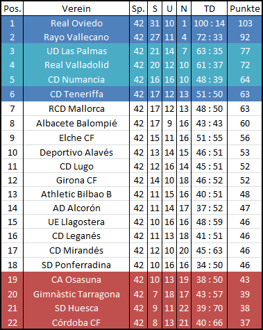 Mit Real Oviedo und Rayo Vallecano kehren zwei Absteiger direkt wieder in La Liga zurück, in beeindruckender Weise setzten sich beide vorne ab, in Finish konnte auch Las Palmas nicht mehr mithalten und musste durch die Playoffs. Dort war bereits in der ersten Runde Schluss, man scheiterte an Real Valladolid. Doch auch die Violetten konnten sich nicht über den Aufstieg freuen, denn man scheiterte im Finale mit 3:1 an CD Teneriffa, die erst am letzten Spieltag Mallorca noch überholt und sich die Playoffs gesichert hatten. Als Sechster feiert man nun die Rückkehr in die Primera División nach 10 Jahren, damals war es nur ein einjähriges Gastspiel und auch in der kommenden Saison sind die Kanaren krasser Außenseiter. Den bitteren Gang in die Liga Adelante müssen hingegen Sporting Gijón, Real Zaragoza und Pokalhalbfinalist SD Eibar antreten.