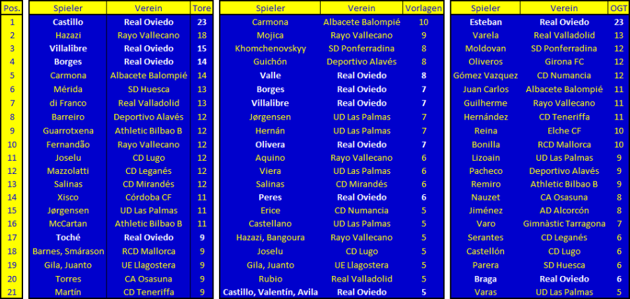 Nicolás Castillo und Asier Villalibre, mit diesem Sturm wird Real Oviedo auch in La Liga ein Wörtchen mitreden können, der Chilene, der 2017 zu Real Valladolid wechselte führte im Winter die Torschützenliste mit 14 Treffern an, als er zu Real Oviedo wechselte, um Mosquito er ersetzen. Auch Celso Borges zeigte sich wieder sehr treffsicher und kam auf 14 Tore. Toché kam in seiner Abschiedssaison auf 9 Tore und schien ebenfalls in der Statistik auf. Bei den Vorlagen war Adriá Carmona von Albacete Balompié top vor Mojica von Aufsteiger Rayo Vallecano. Bei Oviedo brachte es Borja Valle auf 8, das Trio Celso Borges, Asier Villalibre und Lino Olivera auf je 7 Vorlagen. Peres folgte mit 6 Vorlagen und auch Castillo, Avila und der überragende Gerard Valentín schaffte es als einziger Verteidiger in diese Kategorie mit 5 Vorlagen. Mit 23 Toren sicherte sich zudem Esteban die Krone als bester Torhüter, blieb 23 Mal ohne Gegentor. Auch Fernando Braga brachte es auf 6 Spiele ohne Gegentor, das beachtliche daran, er spielte in der Liga nur 8 Mal, insgesamt erhielt das Riesentalent nur in 3 seiner 16 Spiele insgesamt 4 Gegentore, ein Wahnsinnswert!