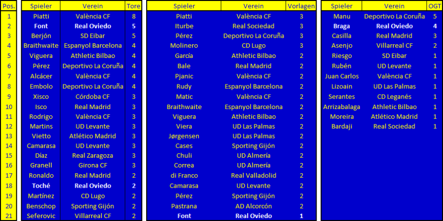 In der Copa konnte lediglich Héctor Font in der Statistik Oviedo gut vertreten, hinter Finalist Pablo Piatti von València belegte der Routinier Rang 2. Der Flügelspieler der Fledermäuse hatte auch die meisten Vorlagen gegeben, musste sich diesen Titel aber mit Iturbe, Molinero und Pérez von Sieger Deportivo La Coruña teilen. Für Rang 2 reichte es auch für Braga, der 5 Mal spielte, davon 4 Mal zu Null, nur Saúl Berjón konnte ihn bezwingen. Der Titel ging an Manu von Sieger Deportivo La Coruña.