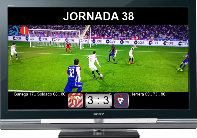 Nach der Pause kamen wir motiviert aus der Kabine, wir wollten uns an den letzten Strohhalm klammern, zumindest hier mal vorlegen, vielleicht zeigte das auch im Estadio Bernabéu, wo man sicher auch die Ergebnisse durchsagt, Wirkung. Doch zuerst mussten wir den zweiten Gegentreffer hinnehmen, ausgerechnet Soldado war es, doch er machte genau das, was ich gedacht hatte. Er verkniff sich den Jubel, schnappte sich den Ball und übergab ihn fair Cristian Herrera. Es folgte der Anstoß, Herrera im Doppelpack mit Celso Borges, der leitet weiter auf Gayà, welcher mit seiner scharfen Hereingabe Herrera fand, nur noch 2:1. Hoffnung keimte auf, denn nur 4 Minuten später traf Herrera von der Strafraumgrenze erneut, 2:2! Dann ging es in die heiße Schlussphase, Eibar fand nun immer besser in die Partie, aber Sevilla blieb gefährlich, vorallem durch den eingewechselten Bacca und Soldado. Dann kam die 80. Minute, Gayà eroberte im Mittelfeld, legte quer zu Jesé, der direkt weiterleitete und da stand Herrera, GOOOOOOLLLLLLL de Eibar, nun hielt es keinen mehr auf seinem Sessel, 2:3, Herrera drehte das Spiel hier im Alleingang, alles hoffte nun auf Real Madrid. Dann ertönte es aus dem Lautsprecher, Real Madrid gegen València, jubelnde Gesichter bei Eibar, gefolgt von einem Aufschrei, in dem Moment, als es 1:1 aus dem Lautsprecher ertönte, kam Roberto Soldado zum Abschluss und er bezwang Irureta ein weiteres Mal, 3:3! Eibar für 5 Sekunden Meister 2017/18, denn die Schlussoffensive brachte nichts mehr ein. Kollektive Enttäuschung in Sevilla, die Spieler trösteten sich gegenseitig, Eibar musste sich den punktegleichen Valencianern geschlagen geben und wurde Vizemeister, Sevilla landete mit dem Remis nur auf Platz 8 und verpasste damit die Europa League um einen Punkt! Soldado und Herrera vertieft in Gespräche, wir haben die ersten Stimmmen!