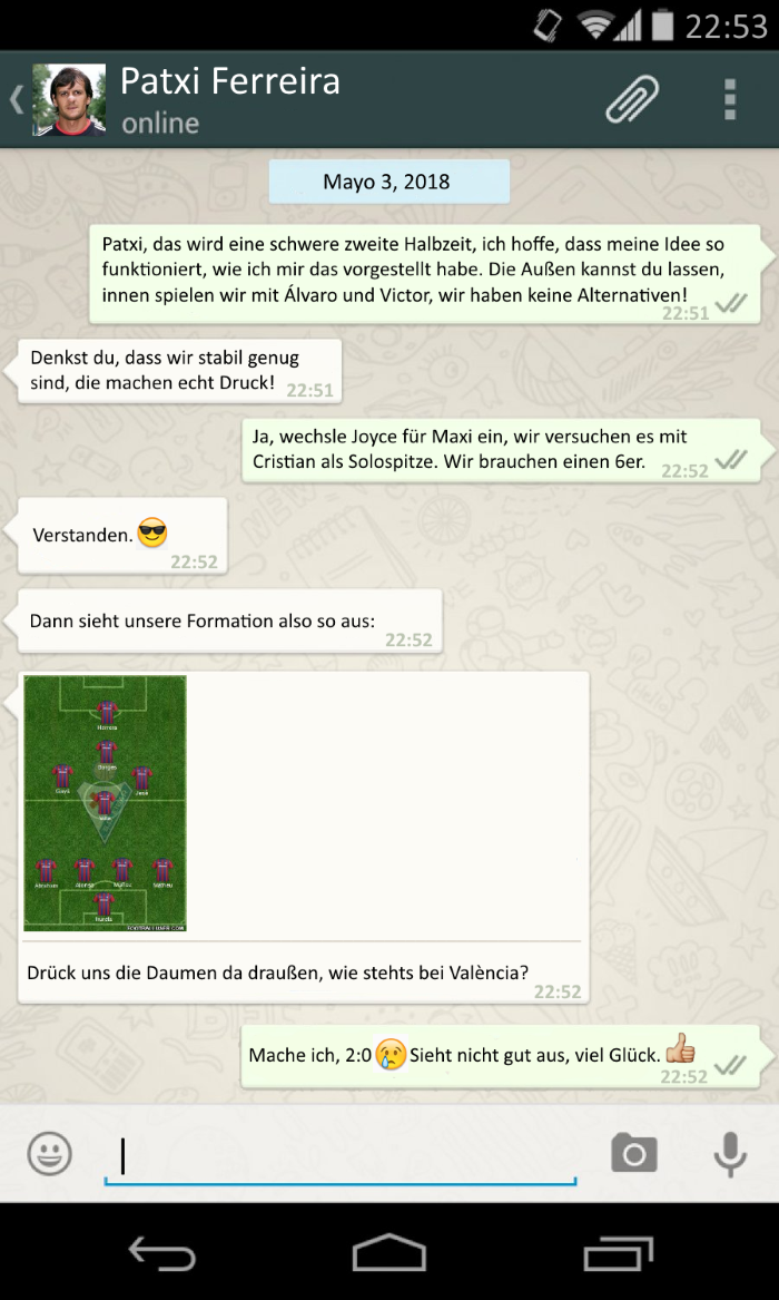 In der Halbzeit bekam Co-Trainer Patxi Ferreira noch die nötigen Anweisungen von Gaizka Garitano per whatsapp.