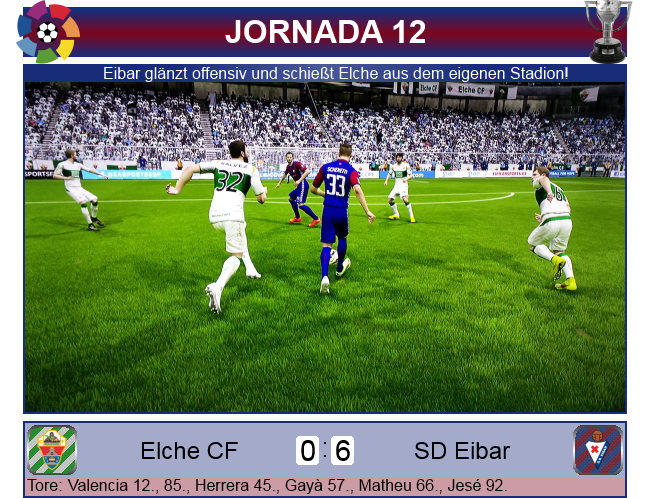 Damit schien die Gegenwehr gebrochen, die zweite Hälfte gehörte ganz und komplett Eibar. José Gayà leitete mit einem schönen Solo, abermals nach Pass von Schenetti mit dem 3:0 den Anfang vom Ende ein. Kurz darauf erzielte Matheu ebenfalls aus einem Konter das 4:0, seinen 80 Meter Sprint belohnte erneut Schenetti mit dem Zuspiel. In der Schlussphase sorgten nochmals Valencia und der eingewechselte Jesé in der Nachspieluzeit für den deutlichen Sieg, 0:6, Eibar schoss Elche aus dem eigenen Stadion!