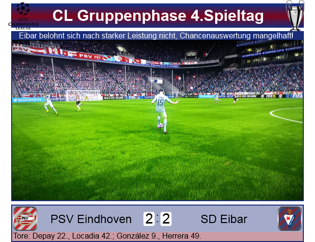 Nach der Pause kam Eibar wie schon zu Spielbeginn aus der Kabine, die Worte von Garitano zeigten Wirkung und Cristian Herrera konnte nur wenigen Minuten nach der Pause zum erneuten Ausgleich treffen, 2:2. Eibar rannte nun förmlich an, von PSV kam nur noch sporadisch etwas, doch vorne vergab man die besten Chancen, oder scheiterte am Schlussmann. Am Ende blieb es beim Remis, Eibar muss weiter auf den ersten Sieg in der Königsklasse warten, doch die Chance lebt nach wie vor!