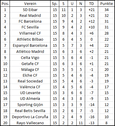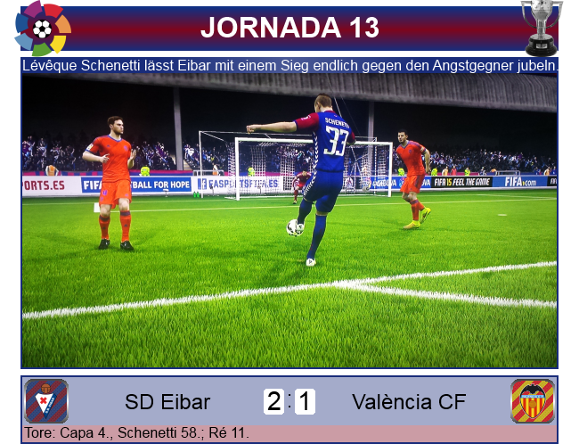 Auch in der Liga ging es zur Sache, mit València wartete niemand geringerer als der Meister auf den Tabellenführer aus Eibar. Doch die Fledermäuse hinkten ihren Erwartungen deutlich hinterher und belegten nach 12 Spielen gerade einmal Platz 14. Bereits nach 4 Minuten wurde auch offensichtlich, warum es bei València nicht rund läuft, einen haarsträubenden Fehler von Victor Ruiz konnte Ander Capa ausnutzen und traf früh zum 1:0. Doch die Antwort ließ nicht lange auf sich warten, Juan Manuel Ré, der Eigenbauspieler, der den verletzten Jackson Martínez ersetzte, bereitete der Defensive Eibar's die meisten Probleme und konnte nach Traumpass von Feghouli ausgleichen.