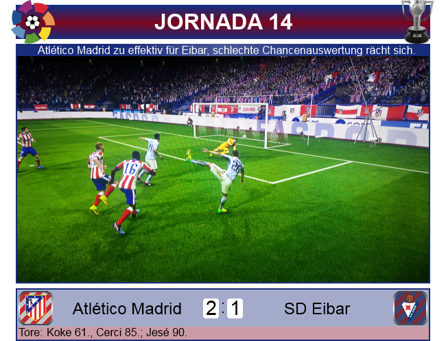 Wieder nichts zu holen für Eibar auswärts im Estadio Vicente Calderón. In letzter Zeit mauserte sich Atlético Madrid zuhause zu einem wahren Siegerteam, auch der FC Barcelona scheiterte in dieser Saison bereits dort, nun auch Eibar. Dabei passierte 50 Minuten einmal gar nichts, einen nicht erwähnenswerten Torschuss von Borges später, ging Atlético dann mit deren erster Chance in Führung. Koke setzte sich links gegen Matheu durch, traf aus spitzem Winkel wuchtig zum 1:0. Aber Eibar antwortete beinahe im Gegenzug, aber Herrera scheiterte am starken Jan Oblak. Just in die beste Phase der Basken hinein setzte Atlético einen tödlichen Konter, den Alessio Cerci mustergültig abschloss. Kurz vor Ende der regulären Spielzeit konnte Jesé noch auf 2:1 verkürzen, aber der Sturmlauf in der Nachspielzeit blieb unbelohnt, Atlético siegte 2:1.