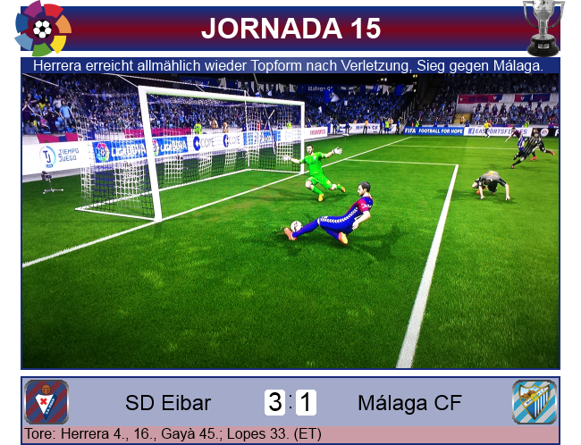 Málaga war der nächste Gegner in der 15. Runde von La Liga. Eibar schonte Valencia für das CL-Spiel gegen Celtic, ebenso wie Borges. Dafür spielte Herrera, zusammen mit Maxi Mendez und genau diese Kombination funktionierte bereits in der 4. Minute perfekt, den Steilpass des jungen Spaniers verwertete Herrera eiskalt zur frühen Führung. Nach einer guten Viertelstunde legte Herrera dann noch einen nach, wieder bediente ihn Villa im perfekten Moment, die Chance ließ er sich nicht nehmen, 2:0. Nun wurde aber Málaga stärker, drückte auf den Anschluss, der in der 33. Minute fiel. Einen Schuss von Finnbogason fälschte Antonio Lopes unglücklich und unhaltbar für Irureta ins eigene Tor ab. Doch Málaga verpasste die Chance, nachzusetzen, Eibar rettete sich über die kurze heikle Phase, bis in der Nachspielzeit José Gayà mit einer sehenswerten Einzelaktion auf 3:1 stellte.