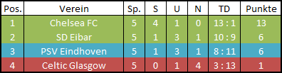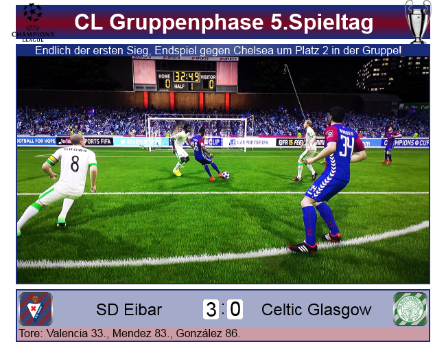 Von Celtic kam kaum etwas, die Auswärtsschwäche der Schotten kam Eibar heute entgegen, auch wenn man lange zittern musste. Das lag vorallem daran, dass vorne Herrera und Valencia Chance um Chance vergaben, entweder scheiterte man an der Präzision, am Aluminium oder der Schlussmann brachte noch die Hand dazwischen. Der 14. Torschuss sitzte dann allerdings endlich. Maxi Mendez, der kurz zuvor für Herrera eingewechselt wurde, traf zur Vorentscheidung. Nach einem Eckball wenig später köpfte Arturo González noch das 3:0, bei diesem Sieg blieb es letztendlich auch. Weil PSV aber im Parallelspiel gegen Chelsea ein Unentschieden holte, muss man nun wohl im letzten Spiel gegen die Engländer gewinnen, während PSV zuhause gegen Celtic alles klar machen kann.
