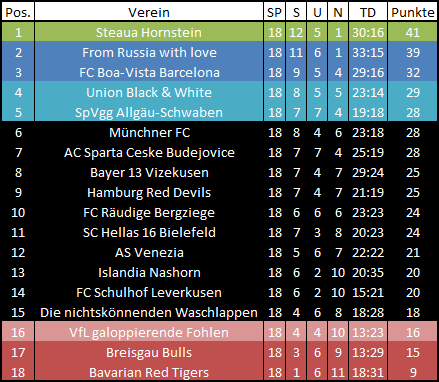 Und mit Hartmann gleich der nächste, der doppelt trifft! Auch das letzte Spiel ist in Deutschland über die Bühne gegangen. Dabei verliert die halbgriechische Truppe aus Bielefeld gegen die Bullen aus dem Breisgau, und auch hier, doppelt gemoppelt hält besser, Feghouli ist der 5. Doppeltorschütze an diesem Spieltag. Die Breisgau Bulls schließen damit wieder zum Releationsplatz auf, die Liga ist sehr eng zusammen. Das wars dann auch, György, ich sage danke, hat mich gefreut, ein Abschlussstatement?