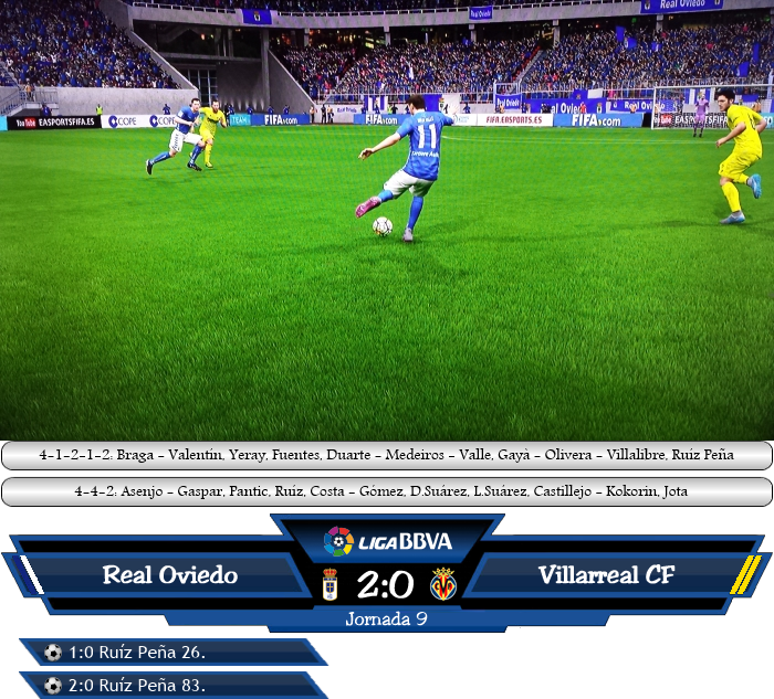 Real Oviedo gegen den amtierenden Meister Villarreal CF, oder auch Zweiter gegen 18. hieß es am 9.Spieltag. Das gelbe U-Boot spielte nach der überragenden letzten Saison bisher grottenschlecht und stand nach 8 Spielen noch ohne Sieg auf einem Abstiegsplatz! Kurioserweise konnte man in der CL 3 Siege mit einer Tordifferenz mit 8:1 feiern, keiner wusste so recht, was in der Liga nicht lief. Zudem machte sich die Verunsicherung breit und man merkte den Gästen an, wie sehr die aktuellen Situation an ihnen nagte. Einen gewaltigen Schnitzer von Pantic hätte Gayà schon in der 8. Minute nutzen können, aber der Flügelspieler scheiterte an Keeper Asenjo. Bei den Gästen ging die größte Gefahr durch die beiden Suárez in der Mitte aus, doch der entscheidende Pass gelang kaum. Anders bei Real Oviedo, wo man auf einen komplizierten Spielaufbau verzichtete und das Mittelfeld schnell überbrückte. Nach einem sehenswerten Steilpass von Gayà war es dann in der 26. Minute Manuel Ruíz Peña, dem endlich der Knopf aufging und seinen ersten Treffer bejubeln durfte. Villarreal tat sich schwer, kam nur selten zu guten Möglichkeiten und auch im Passspiel innerhalb der Mannschaft war der Wurm drinnen. Daran änderten auch die Wechsel zur Pause wenig, aber vorallem Castillejo kam in der zweiten Halbzeit immer besser in Fahrt, bis er unverständlicherweise ausgewechselte wurde und seinem Ärger Luft ließ. Oviedo verwaltete die Führung sicher und in der 83. Minute gab es einen Konter, Borja Valle schickte Ruíz Peña steil und der traf zum 2:0 Endstand, der neue Tabellenführer, Atlético patzte mit einem 1:1 gegen Eibar, besiegte den amtierenden Meister hochverdient mit 2:0. |