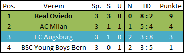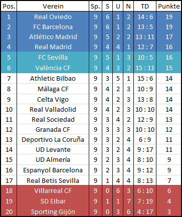 Ein hervorragender Saisonstart für die Oviedistas! Zum Auftakt verliert man gegen Valencia, doch dann folgen drei Siege, unter anderem gegen den Zweiten aus Sevilla. Dafür spielt man nur Remis beim anderen Verein aus Sevilla, doch das reicht um nach fünf Spieltagen von der Tabellenspitze zu grüßen. Zudem ein perfkter Start in die Europa League, die vermeindlich schwierigste Aufgab, auswärts im San Siro, meistert man mit einem 2:1 Auswärtserfolg, Augsburg wird dann vor eigenem Publikum auseinandergenommen, weiter so!