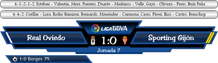 El derbi asturiano am 7.Spieltag. Das erste seit drei Jahren lockte viele Fans ins Nuevo Estadio Carlos Tartiere und jeder war heiß auf diese Partie. Oviedo war nach der Pleite gegen Atlético auf Platz 5 zurückgefallen, während Gijón noch ohne Sieg auf dem letzten Platz stand. Trotz Derbycharakter änderte sich am Spielgeschehen kaum etwas, Oviedo spielte, war überlegen und der erste Treffer nur eine Frage der Zeit. Doch die Defensive der Sportinguistas ließ wenig bis gar nichts zu und so wurde die Partie für Oviedo schnell zum Geduldsspiel. Peres lieferte eine gute Leistung ab, konnte den gesperrten Villalibre nahezu gleichwertig ersetzen. Immer näher rückte das Spielende, doch Oviedo blieb weiterhin ruhig und versuchte, die Hektik zu vermeiden. In die Schlussphase hinein traf Borja Valle mit einem scharfen Schuss die Stange. Coach Zinedine Zidane reagierte und wechselte, bewies dabei ein goldenes Händchen, in der 77. Minute kam Alt-Spielmacher Borges für Olivera und mit seinem ersten Ballkontakt und einen platzierten Schuss ins lange Eck fixierte der Costaricaner den 1:0 Endstand. |
