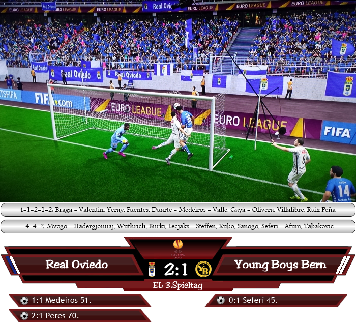 Unter der Woche wurde es für Oviedo erneut in der Europa League ernst. Gegen die Young Boys Bern wäre alles andere als ein Sieg nach den bisher gezeigten Leistungen eine Enttäuschung. Oviedo begann mutig und setzte die Schweizer früh unter Druck. Dabei hatte Medeiros in der 19. Minute eine erste große Chance, scheiterte aber aus rund 30 Metern an der Querlatte. Exakt 5 Minuten später beinahe die selbe Szene, wieder kam Valle aus der Distanz zum Abschluss, diesmal lenkte Mvogo den Ball mit den Fingerspitzen noch an die Latte. Von den Gästen war in der ersten Halbzeit kaum etwas zu sehen, trotzdem nutzte man die einzige Halbchance wenige Augenblicke vor dem Pausenpfiff zur Führung. Seferi nutzte einen Fehler von Yeray aus, der die Flanke mit dem Kopf nur abscherzelte, ihn genau für den Schweizer auflegte. Oviedo ließ sich davon aber nicht verunsichern, spielte weiter nach vorne und kam in der 51. Minute zum Ausgleich. Über Gayà kam der Ball zum zur Pause eingewechselten Borges, der lieferte die perfekte Flanke für Medeiros über Mvogo hinweg, der Portugiese brauchte aus etwa einem Meter nur noch einnicken. Die Young Boys kamen nun kaum noch aus der eigenen Hälfte heraus und man merkte, dass Oviedo mehr wollte, als dieses Remis. Und in der 70. Minute stach ein weiterer Joker. Der kurz zuvor für Ruíz Peña gekommene Peres traf nach schönem Lochpass von Celso Borges zum 2:0. Angesichts der erneuten guten Leistung, fragte man sich bei Oviedo aber erneut, ob es denn ohne Borges wirklich schon geht? |