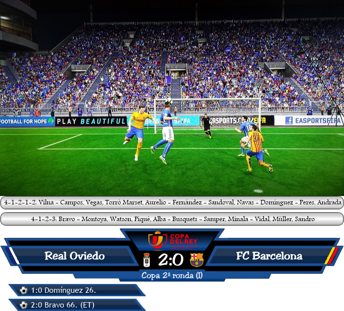 Das Los meinte es nicht gut mit Real Oviedo, mit dem FC Barcelona bekam man gleich in der zweiten Runde, der ersten für die La Liga Clubs, den wohl schwierigsten Gegner. Doch man wollte sich nicht verstecken, zeigte keinen Respekt und legte gut los. Mit einer B-Elf, wie es Oviedo standesgemäß in der Copa handhabt, zog man den Katalanen den Nerv, vorallem der junge 17-jährige Peruaner Eligio Domínguez zeigte einmal mehr sein großes Talent und traf nach einem Weltklassesolo mit einem präzisen Schuss zum 1:0. Der junge Watson machte hierbei keine gute Figur. Nach der Pause kam Barca besser in die Partie, setzte Oviedo unter Druck, aber Vilna lief zur Höchstform auf und entschärfte zwei Hochkaräter von Müller und Vidal. Kurz darauf kam Messi ins Spiel und der quirlige Argentinier stellte gleich Mal Aurelio vor große Probleme, aber erneut war Vilna zur Stelle. Die Szene des Spiels schlechthin gab es dann in der 66. Minute. Einen Rückpass von Watson brachte Bravo nicht unter Kontrolle, stellte sich in Folge mehr als dämlich an und fabrizierte ein unfassbares Eigentor! Barcelona schoss sich hier selbst deutlich ins Hintertreffen, denn der so wichtige Auswärtstreffer gelang nicht mehr, das 2:0 ist schon eine richtig gute Ausgangsposition für Oviedo. |