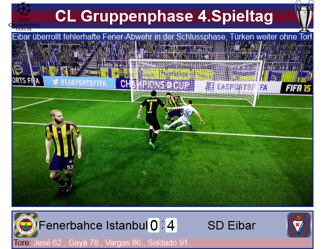 Nach dem Wechsel dasselbe Bild, die Basken mit Powerfußball und Fenerbahce in Handballmanier rund um den eigenen Sechzehner versammelt. In der 62. Minute mussten sich die Fans dann ungläubig die Augen reiben, einen Schuss von Soldado konnte Aziz nicht festhalten, der letzte Verteidiger trickste gegen Jesé, anstatt den Ball wegzudreschen, der Spanier spritzte prompt dazwischen und stocherte das Leder zwischen dem Fuß des Türken ins Tor, 1:0 für Eibar, was für ein Amateurfehler. Nun brach Fener aber wieder in alte Muster zusammen, in der 78. Minute narrte José Gayà mit einem traumhaften Solo die gesamte Abwehr, keiner attackierte ihn ernsthaft, am Ende stand das 2:0 als logische Schlussfolgerung (Video). In den letzten Minuten durfte sich auch noch das Duo Vargas und Soldado in die Torschützenliste eintragen, die Vorlagen kamen übrigens immer vom anderen der zwei! Mit dem 0:4 war Fener am Ende noch gut bedient, denn in der Schlussminute traf Masó Ribas noch die Querlatte.