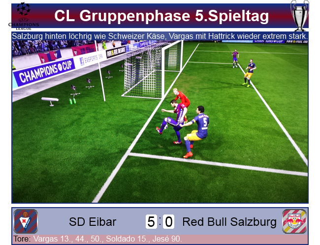 Was in Halbzeit zwei folgte, war eine Lehrstunde. Shootingstar Vargas narrte mit seinem dritten Treffer die Bullen erneut, keiner konnte den wieselflinken Mexikaner stoppen, danach war es einige Male Gulacsi zu verdanken, dass die Salzburger hier nicht mit einem Debakel wieder heimgeschickt wurden. Zu allem Überfluss sah in der 70. Minute noch Vorsah die rote Karte für eine Notbremse. Den folgenden Freistoß setzte Soldado an die Stange. In der Schlussminute gelang Jesé per Distanzschuss der Endstand, 5:0 für Eibar, auch Salzburg konnte den Basken die weiße Weste nicht schmutzig machen. Besonders bitter: Vargas verletzte sich kurz vor seiner geplanten Auswechslung an der Schulter und fällt 4 Wochen aus.
