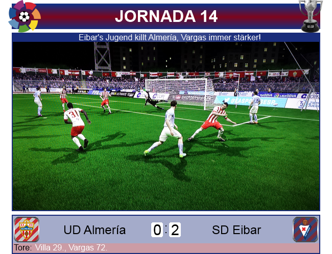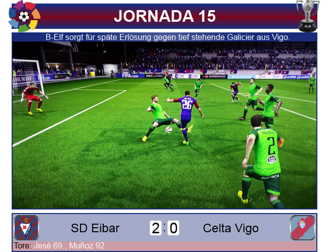 Eibar musste zwei Spieler vorgeben, Joyce Villa, der sich in der Schlussphase der Almería-Partie verletzt hatte und mit gebrochenem Knöchel 3 Monate ausfallen wird und Lévêque Schenetti, der sich in der Länderspielpause verletzte und mit Schulterprellung rund 4 Wochen fehlen wird. Vorallem die Verletzung von Villa wog schwer bei Eibar, weil er als absoluter Stammspieler und Spielmacher für das Angriffsspiel wichtig war. Arruabarrena sprang für ihn ein. Gegen Celta Vigo merkte man schon, dass die Kreativität von Villa deutlich fehlte, Arruabarrena bemühte sich, Villa annähernd gleichwertig zu ersetzen, was phasenweise auch ganz gut aussah. Dennoch blieb es bei der torlosen ersten Hälfte, Celta stand hinten gut, vorne gab es außer gefährliche Freistöße und Schüsse von Nolito aber nichts. In der 69. Minute war es dann Jesé, der sich in den Strafraum dribbelte, nur zögerlich attackierte wurde und gerade noch rechtzeitig abschließen konnte, der Ball kullerte unter dem hereingrätschenden Verteidiger durch, der Keeper sah den Ball erst sehr spät und konnte nicht mehr reagieren. In der Nachspielzeit köpfte Álvaro Muñoz nach einem Corner noch das 2:0 und machte endgültig den Deckel drauf.