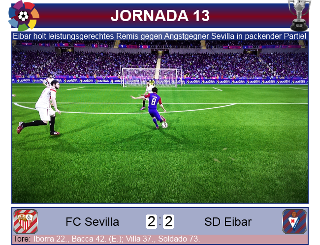 Mit Spezialtraining und in Sevilla-Dressen zum Abschlusstraining versuchte Gaizka-Garitano sein Team auf den Angstgegner einzustimmen, sogar die eigenen Namen hatte man sich aufdrucken lassen. Das zeigte Wirkung, denn anders als zuletzt konnte man gleich zu Beginn den Schalter umlegen und den Andalusiern die Stirn bieten. Doch die schienen genau zu wissen, wie man Eibar erneut überrascht, in der 15. Minute ging alles sehr schnell, nach der Flanke ging Lopes zu ungestühm in den Luftkampf, es gab Elfmeter für Sevilla. Doch Bacca fand in Irureta seinen Meister, der Schlussmann hielt Eibar im Rennen. 7 Minuten später war es erneut eine Flanke, die für Gefahr sorgte, Lopes und Bacca verpassten in der Mitte, doch dahinter hatte keiner Iborra gedeckt, der seelenruhig einschieben konnte. Eibar erneut in Rückstand, doch in der 37. Minute führte ein herrliches Solo von Villa mit Doppelpass mit Soldado zum Ausgleich. Doch kurz vor der Pause gab es erneut Elfer für Sevilla. Wieder trat Bacca an, diesmal traf er, auch wenn Irureta erneut die Ecke erriet, doch der war zu platziert.