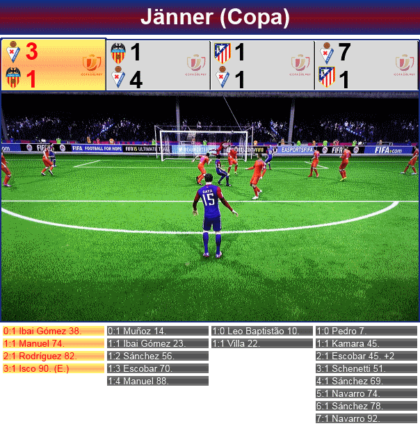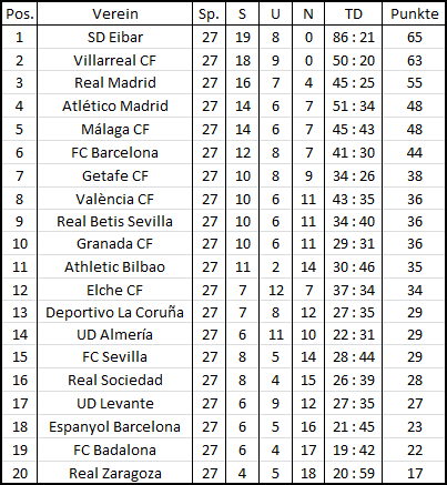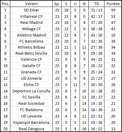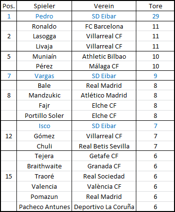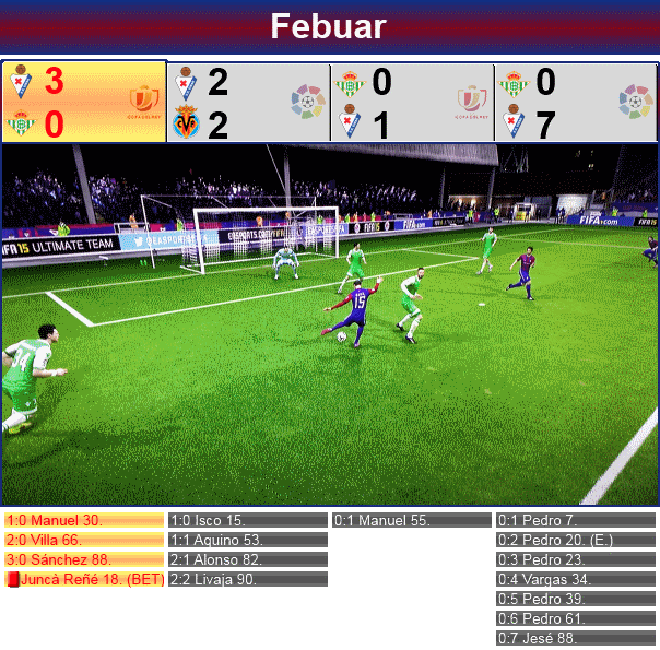 Die erste Hälfte des Februar hatte neben dem Pokalhalbfinale auch zwei Ligaspiele zu bieten. Dabei erwischte man erneut Betis Sevilla, spielt innerhalb von 14 Tagen dreimal gegen die Andalusier und dazwischen steht das Topspiel gegen Villarreal an. Bereits im Hinspiel der Copa del Rey ließ Eibar mit einer B-Elf keine Zweifel aufkommen, dass der Weg ins Finale für Betis enorm schwer sein wird. Denn in der 30. Minute patzte die bis dahin sichere Betis-Abwehr, Jungspund José Manuel war nicht mehr zu halten und schon stand es 1:0. Betis versuchte alles, um das Ergebnis niedrig zu halten und aus Kontern zum Erfolg zu kommen, doch die frühe rote Karte von Juncà Reñé machte den Andalusiern einen Strich durch die Rechnung. Im zweiten Durchgang spielte Eibar zwei klasse Angriffe, Villa mit einer Einzelaktion und Sánchez per Kopf festigten den 3:0 Sieg. In der Liga gegen Villarreal durfte dann wieder die beste Elf ran. Für das gelbe U-Boot galt heute verlieren verboten, wollte man noch ein reelle Chance um den Titel haben. Und das Spitenspiel wurde dem Namen voll gerecht, ein temporeiches Offensivspektakel endete 2:2 Unentschieden, mit dem Punkt konnte Eibar sicher besser leben, es bleiben weiterhin 6 Punkte Vorsprung. Die zwei Gastspiele in der Copa und Liga gegen Betis Sevilla gestalteten sich dann sehr unterschiedlich. Während man im Pokal den Gegner kommen ließ und einige Male Glück hatte, nicht in Rückstand zu geraten, reichte ein satter Schuss von Manuel in der 55. Minute zum 1:0 Auswärtssieg. Ganz anders in der Liga. Mit Pedro in der Startformation lief das Spiel gleich ganz anders und der Superstar zeigte es wieder allen, schoss die überforderte Abwehr von Betis, das heute einen schwarzen Tag erwischt hatte, gnadenlos zusammen, wieder 5 Tore von Pedro, einer davon per Elfmeter, dazu trafen noch Vargas und Jesé. Bitterer Beigeschmack für Eibar: nach einem Luftkampf landete José Gayà unglücklich un brach sich den Knöchel, 3 Monate muss der Liebling von Eibar pausieren, das Saisonfinish und ein mögliches CL-Finale sollten sich aber ausgehen.