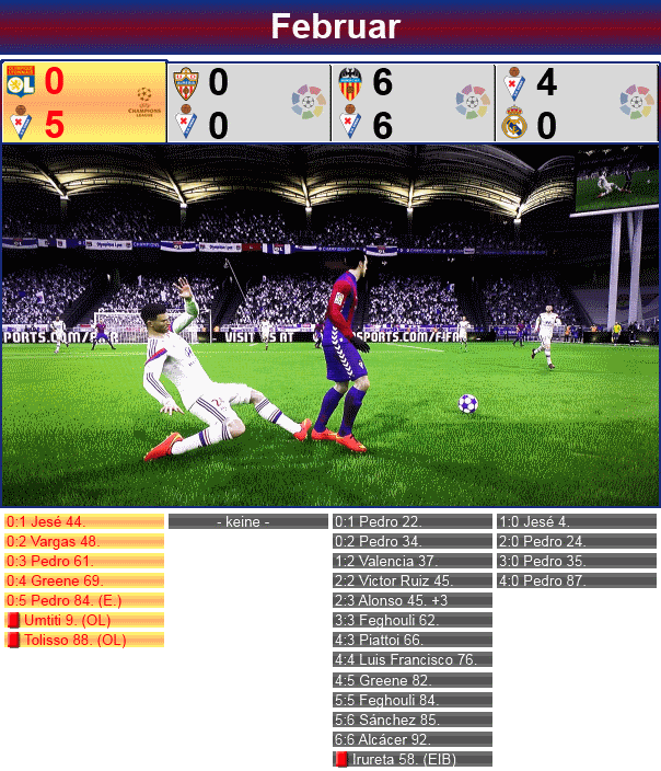 Die zweite Hälfte des Februars hatte es dann wahrlich in sich. Zuerst gab es ein Wiedersehen in der Champions League mit Olympique Lyon, in der Liga warteten mit Almería auswärts ein unangenehmer Gegner, Villarreal musste hier schon Punkte lassen, dazu mit València und Real Madrid zwei Topclubs. Während das Spiel gegen Olympique schon früh eine tragische Wendung nahm und sich die Franzosen quasi selbst schlugen, ließ Eibar keinen Zweifel aufkommen, dass man das Triple verteidigen wolle und damit endlich zur Spitze gehören will. Umtiti sah schon in der 9. Minute die rote Karte nach einer Notbremse, den folgenden Freistoß setzte Pedro an den Pfosten. Dennoch traf er an diesem Abend zweimal, allerdings erst in Hälfte zwei, Jesé, Vargas und Greene waren die weiteren Torschützen, bei den Franzosen entlud sich der Frust in teils üblen Fouls, sodass nach der roten Karte von Tolisso an Ende nur noch 9 Franzosen am Platz standen. Bei der üblen Attacke von Tolisso an Pedro verletzte sich auch der Superstar, fehlt Eibar aber zum Glück nur gegen Almería.